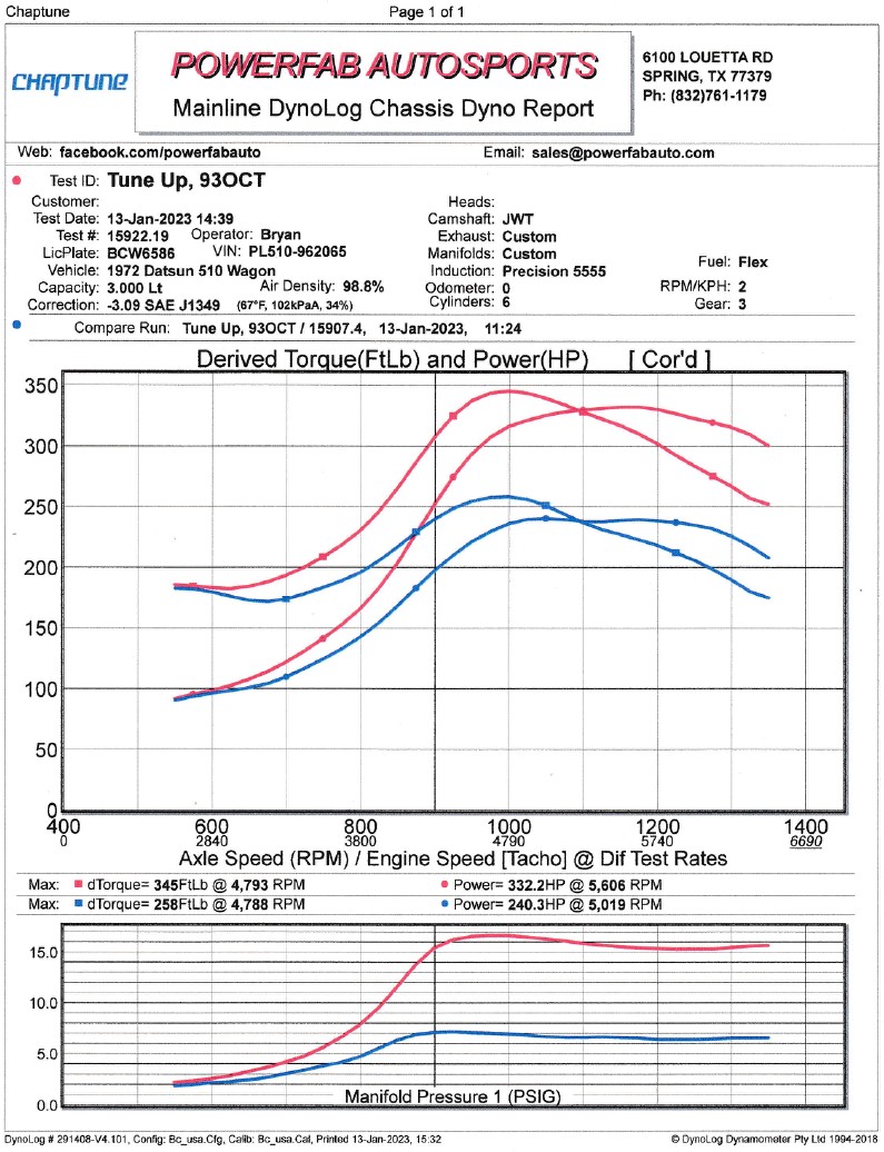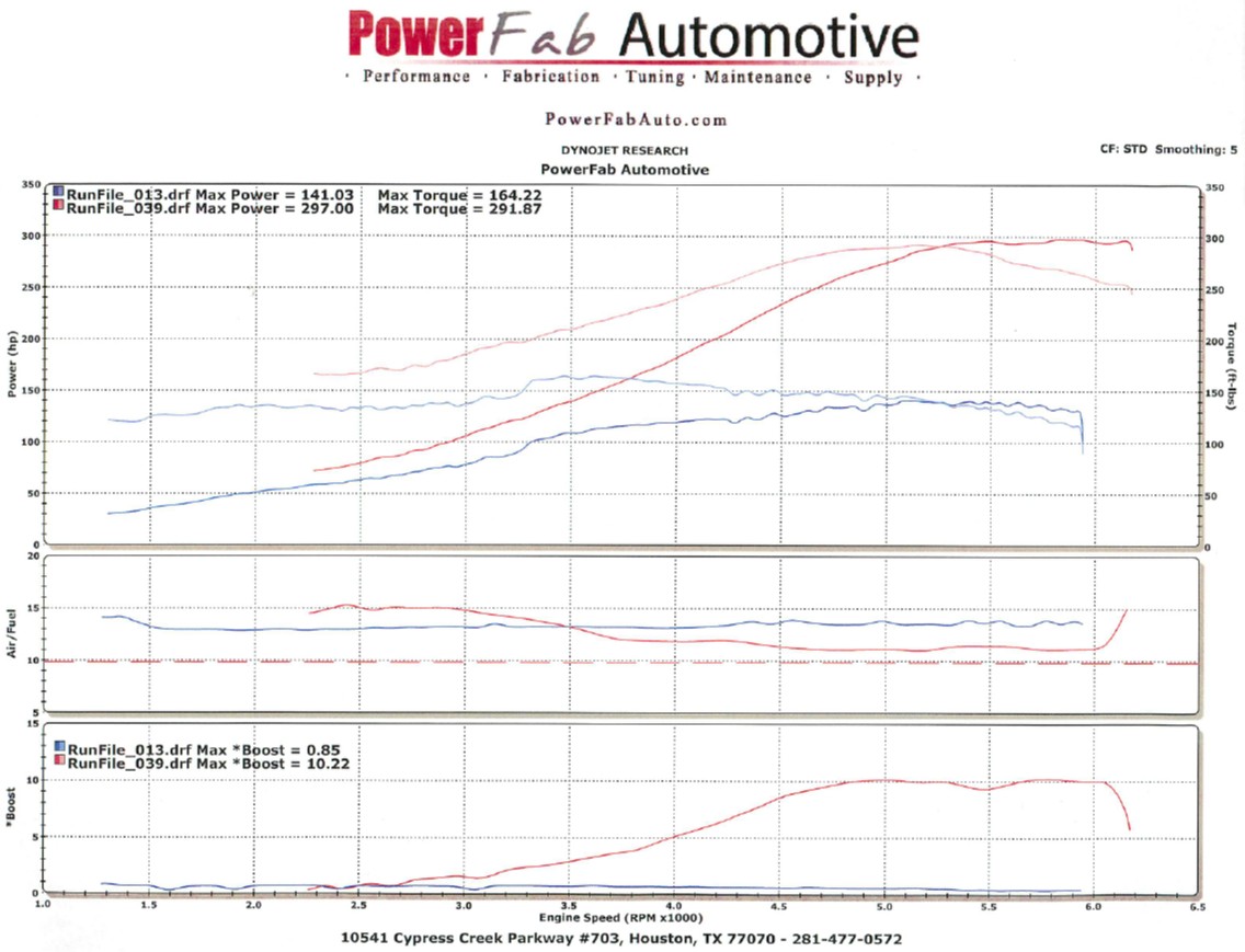 The turbo installation was first done with Nistune. I wanted more low end torque so I swapped the ECU to a Haltech 2000, changed the turbo exhaust housing from .82 AR to .64 AR, installed LS1 coils, oil cooler with remote filter, Pathfinder intake, boost control solenoid, Jim Wolff cams with tuning to bring on the boost sooner with less lag. You can see the difference this made in reviewing the torque curves on the dyno runs above.