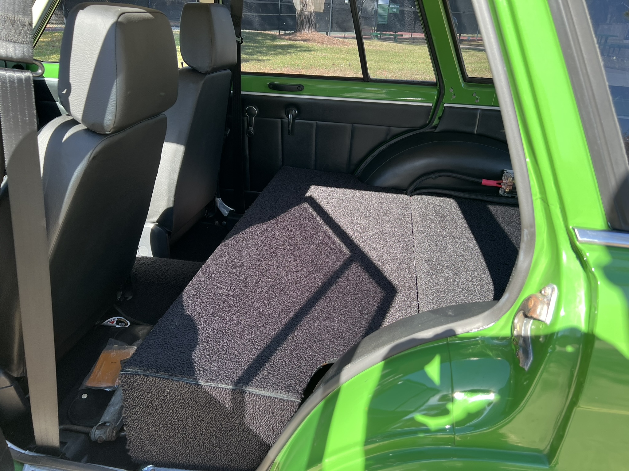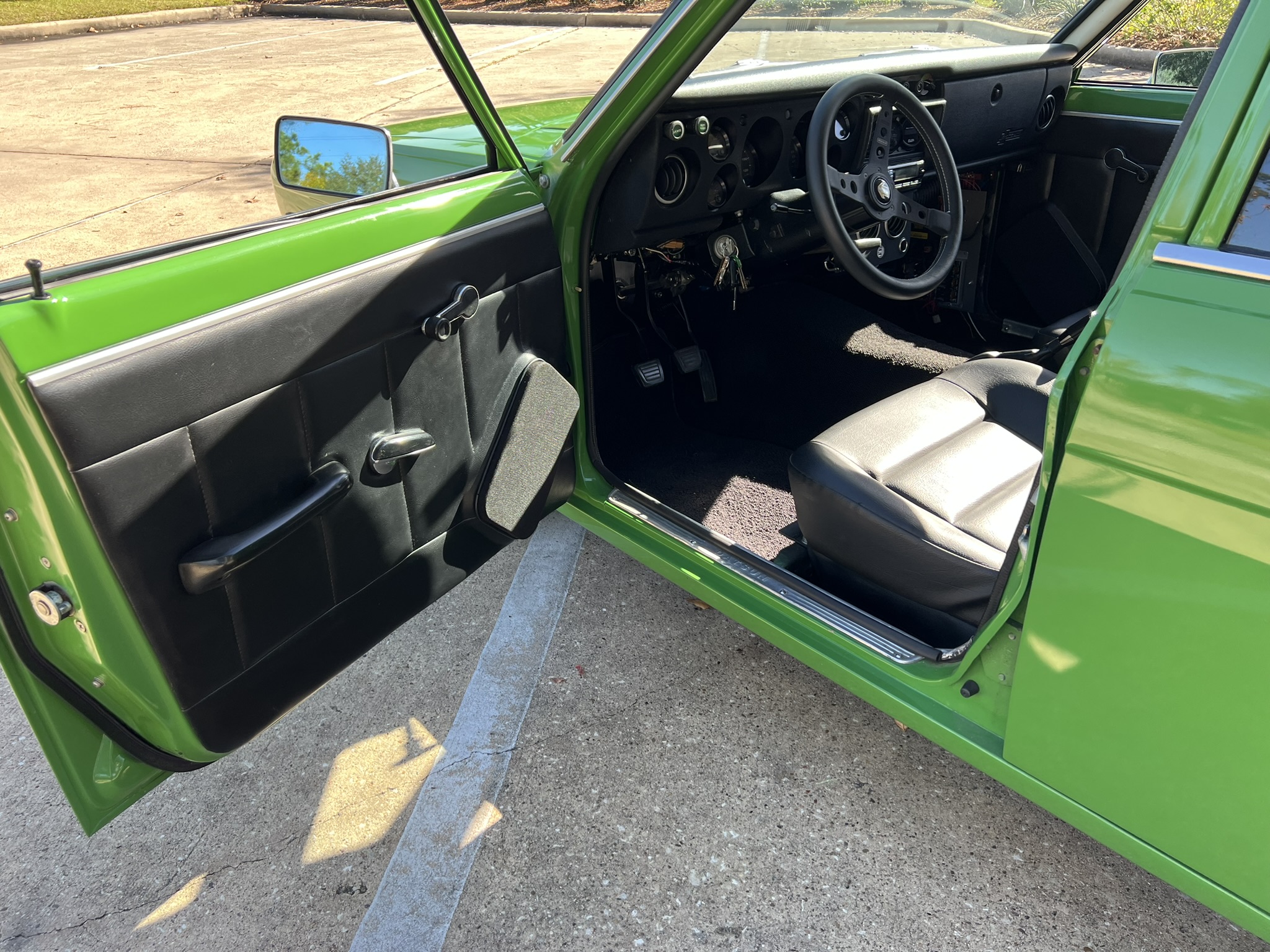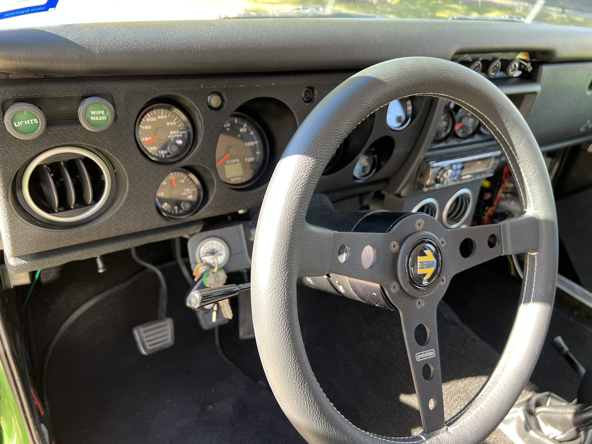 The Interior has Corbeau Sport Seats in the front. The rear seat and door panels were upholstered to match but the back seat has been removed as it was never used. It will be included. Custom Gilson Dash modeled from the Classic Bluebird 1600 SSS includes Speedhut GPS Speedo, Tach, Water Temp, Voltage, Oil Pressure and Fuel Level. Custom Center dash mounts more gauges where the stock radio with a Speedhut vaccum/boost and Air Fuel Ratio. Also is a PLX AFR that is connected with dual sensors and provides the signal to the Haltech 2000 ECU.
