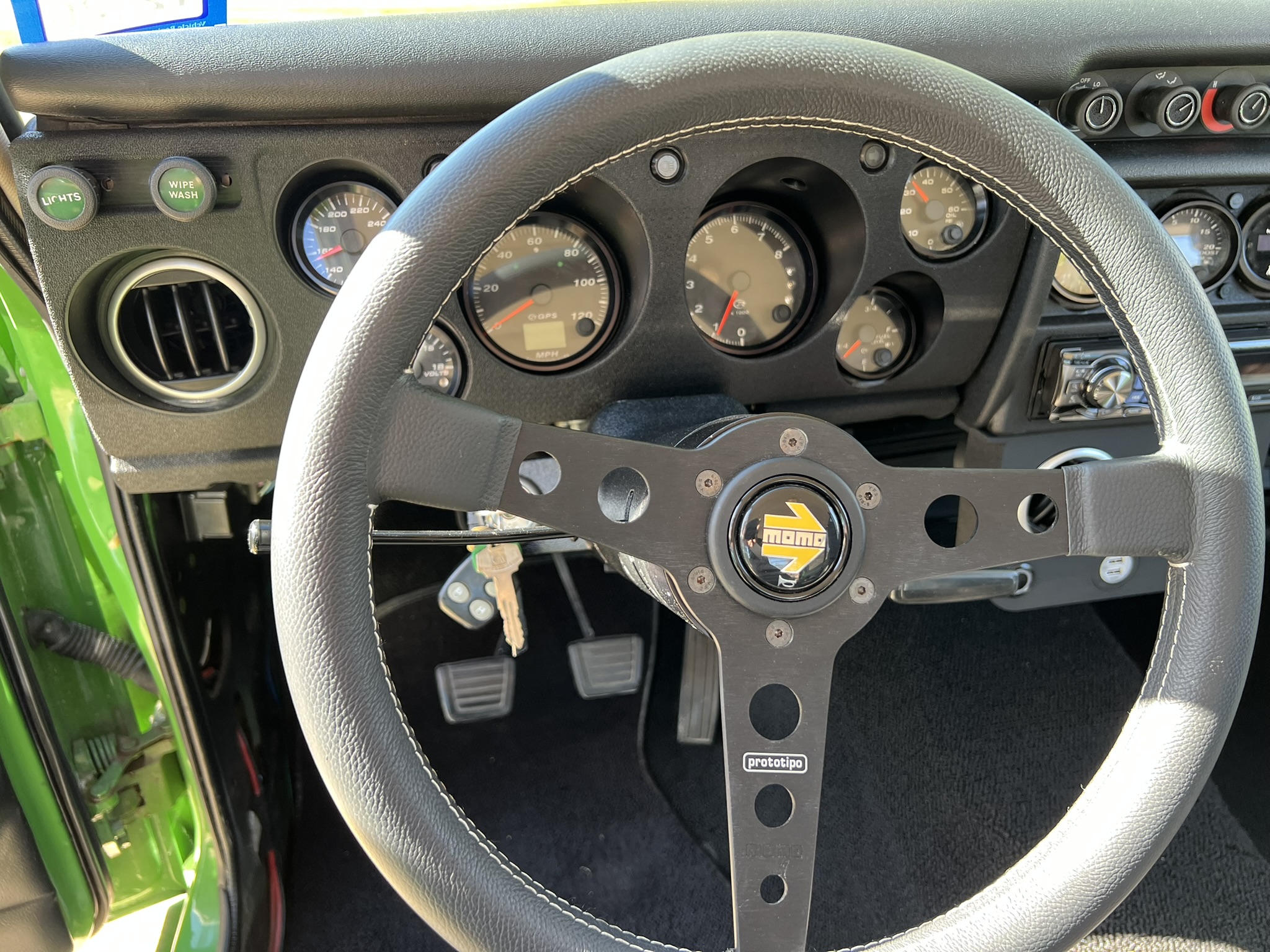 The Momo steering wheel is connected to a Datsun Restomods Electric power steering column that adapted a Toyota Prius Electric steering unit. This work great with the small wheel at low speed.