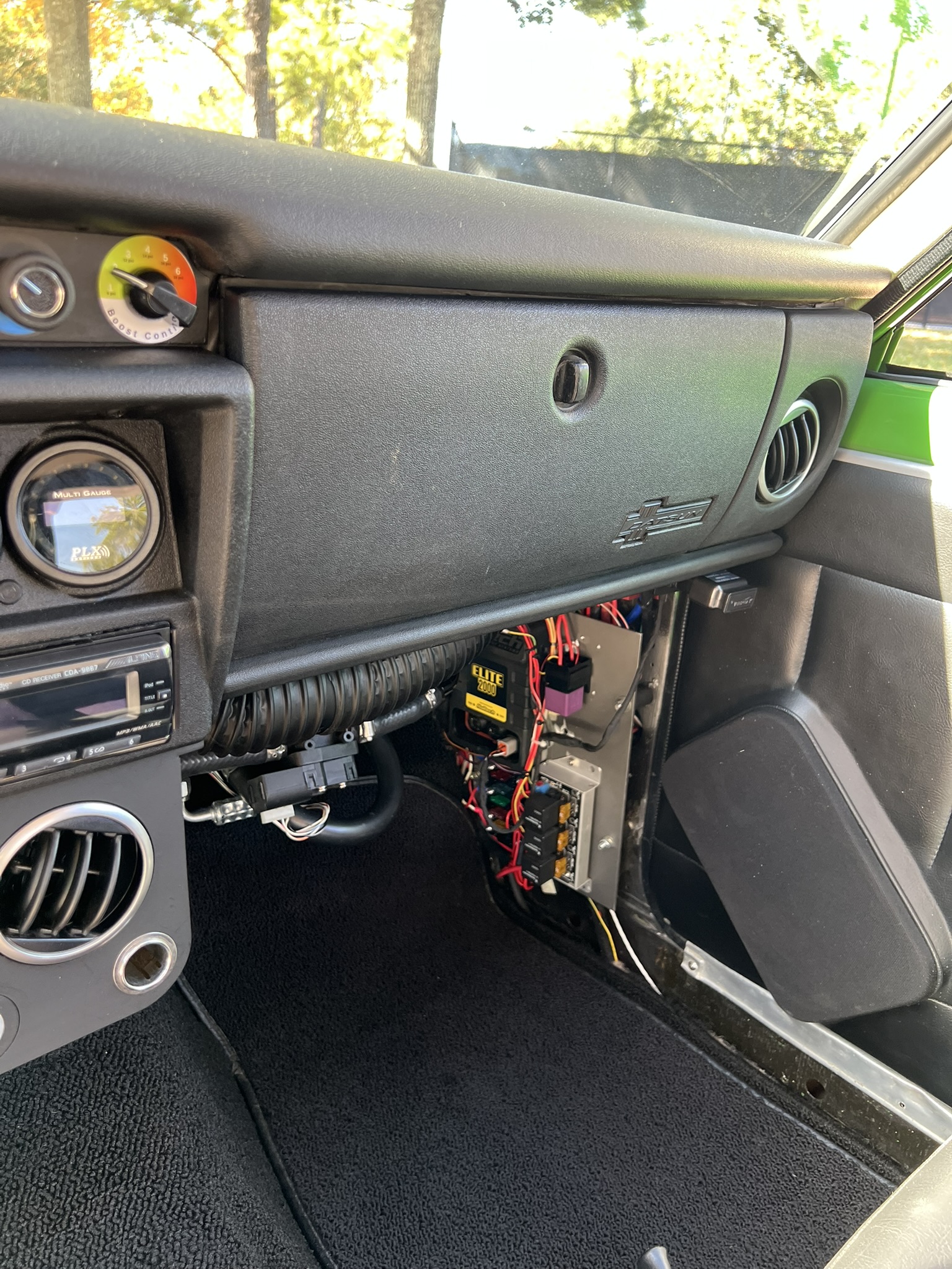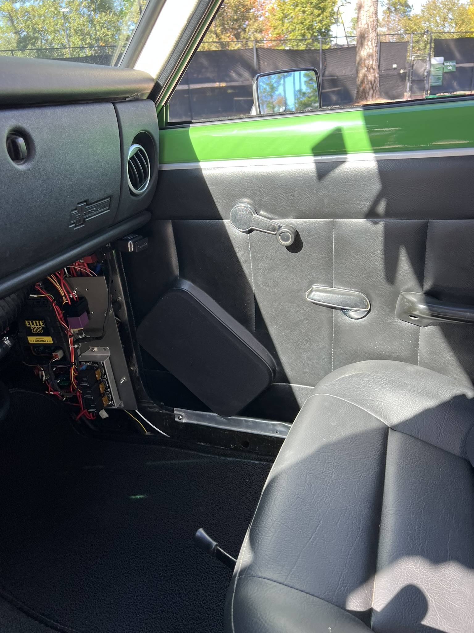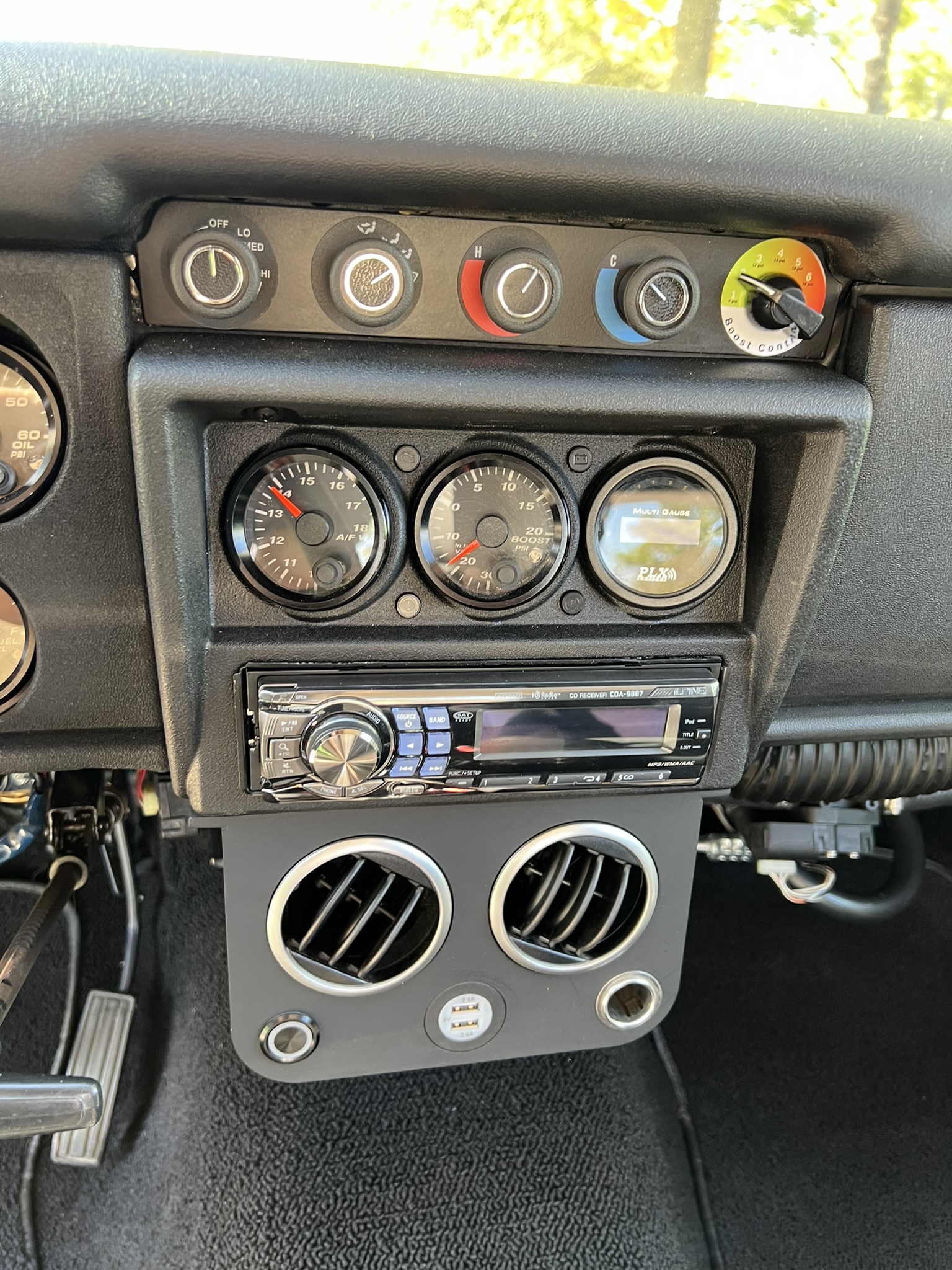 Climate control is provided by a Vintage Air Mini System provide A/C and heat. All outlets air adapted from a Nissan 350Z and the center outlets are mounted on a custom 3D printed panel that includes switched USB and 12 volt outlet for power.